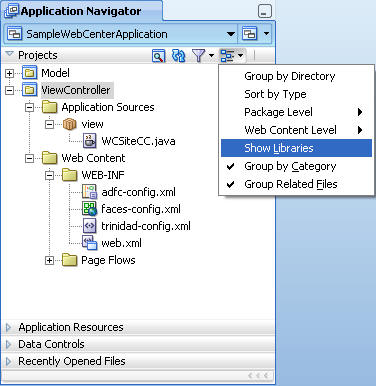 (7) In the Application Navigator, next to the Projects drop-down list, click the Navigator Display Options icon and select Show Libraries.