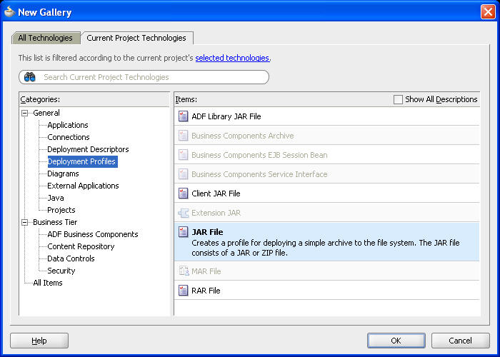 (3) In the New Gallery, select Deployment Profiles, choose JAR File from the Items list, and click OK to generate the JAR profile.