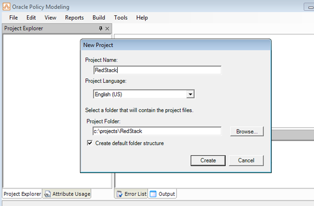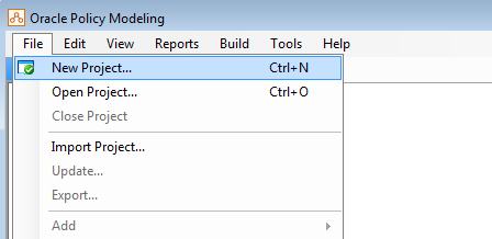 Our first step is to open up Oracle Policy Modeling and create a new project. Select New Project… from the File menu.