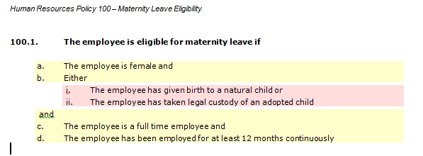 Human Resources Policy 100 – Maternity Leave 100.1. The employee is eligible for maternity leave if a. The employee is female and b. Either i. The employee has given birth to a natural child or ii. The employee has taken legal custody of an adopted child and c. The employee is a full time employee and d. The employee has been employed for at least 12 months continuously