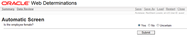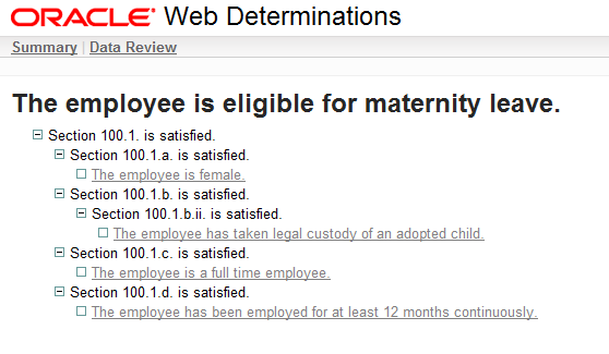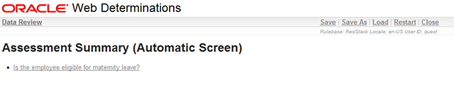 This will start up the Oracle Policy Automation server in the background and open a browser directly to the “Web Determinations” screen which will conduct an interview with a user using our rules. Click on the Is the employee eligible for maternity leave? link to start an interview.