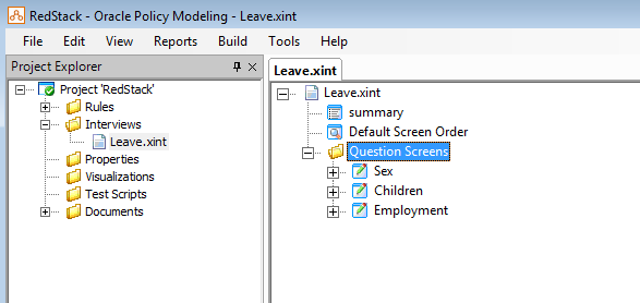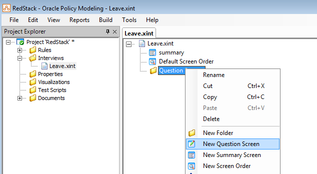 Now double click on your new Interview to open it in the main editing pane (on the right). Next, right click on the Question Screens folder and select New Question Screen from the popup menu.