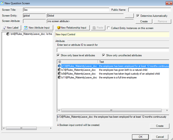 Enter Sex in the Screen Title field at the top, then click on the New Attribute Input button to add a question to this screen. Select “the employee is female” from the list of available questions (on the right) and click on the Create button to add it to the screen. Questions that you have added will appear on the left hand side. Then click on OK.