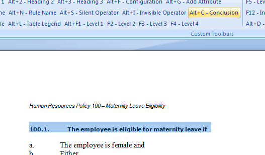 Now we want to tell OPA what the different parts of the document are. First highlight the first line of the document, and mark it as a Rule Name by pressing Alt+N or clicking on Rule Name in the ribbon. Note that the formatting changes slightly to give us a visual clue as to what various parts of the document are.