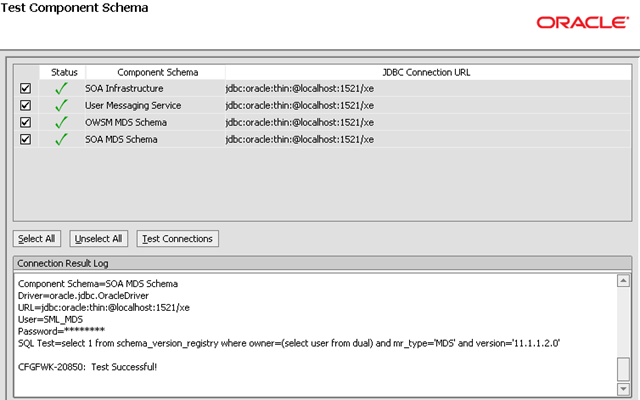 On the next screen, you will need to configure the database connections. Select all of the components in the bottom part of the screen, as shown below, and then enter your database details in the top half as shown. If you changed the default prefix from DEV when you ran the Repository Creation Utility, then you will need to select each component one by one and update the Schema Owner field. When you are done, click on Next.