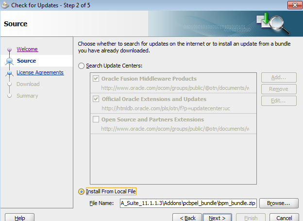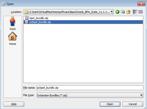 Click on the Browse button and navigate to the pcbpel directory inside the addons directory in the root of the BPA 11.1.1.3 install media.  Select the pcbpel_bundle.zip file and click on Open.