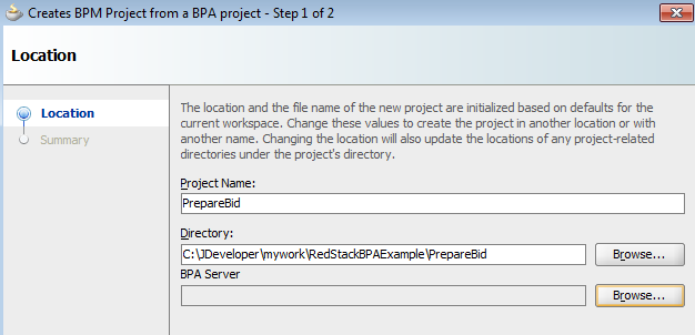 The Create BPM Project from a BPA project wizard will open.  Give your project a a name.  I called mine PrepareBid.  Then click on the Browse button next to the BPA Server field to browse the BPA database and find a process.