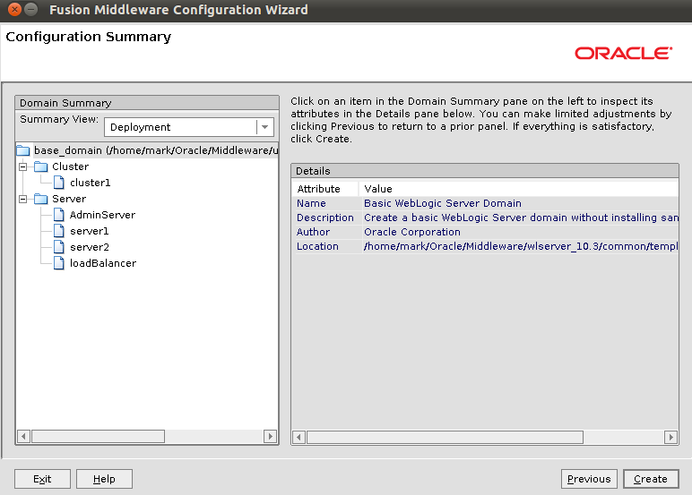 The Configuration Summary is displayed. Click on Create to create your domain.