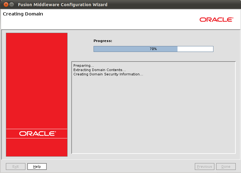After a few moments (or minutes, depending on your machine) the domain creation will be completed. Click on Done to close the wizard.