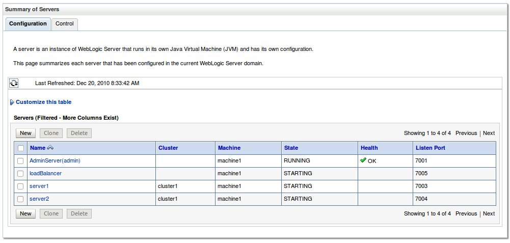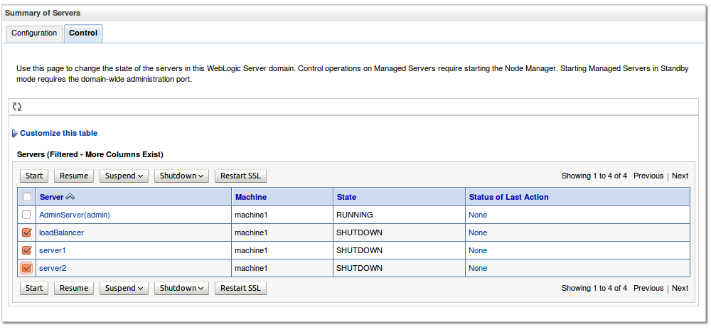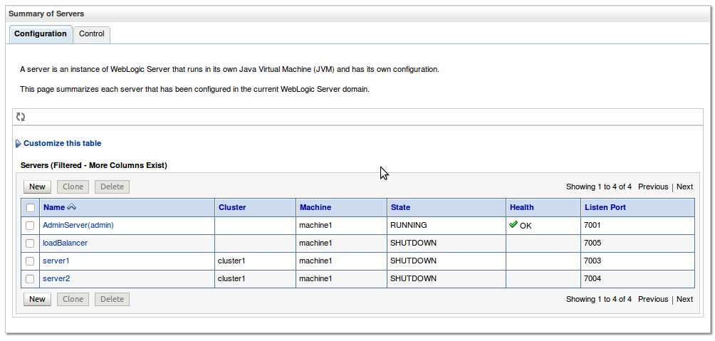 You will see a list of the managed servers we just created. Note that they are all on machine1 and that server1 and server2 are in cluster1. Click on the Control tab (at the top) to switch to control (not configuration) mode.