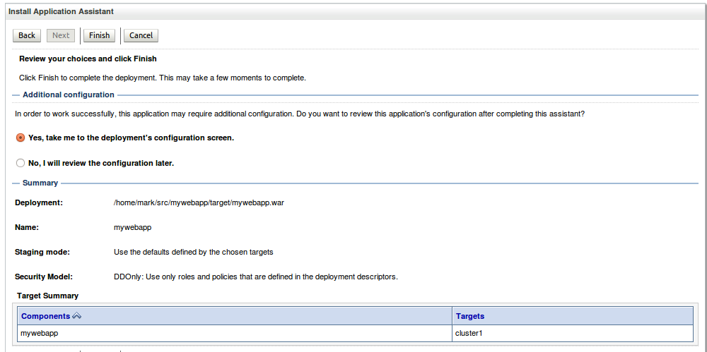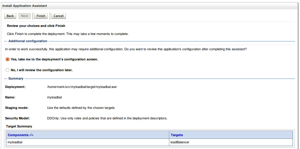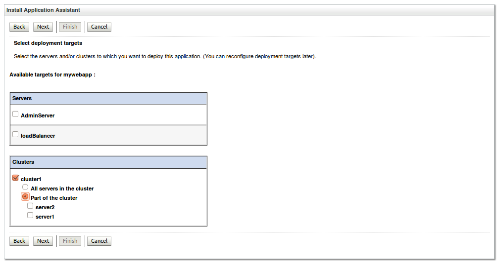 This time, be sure to target this application to the loadBalancer managed server only. This tells WebLogic that the application will only run on that one managed server. Then click on Next.