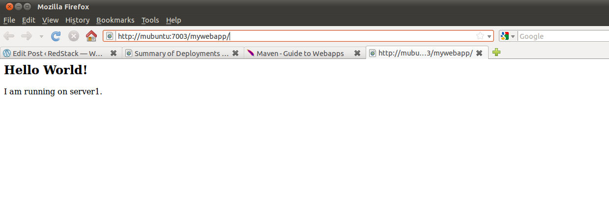 So the URL will be http://yourserver:7003/mywebapp/. Substitute in the correct port number if yours is different. You should see your index.jsp page display as shown below. Note that it says it is running on server1.