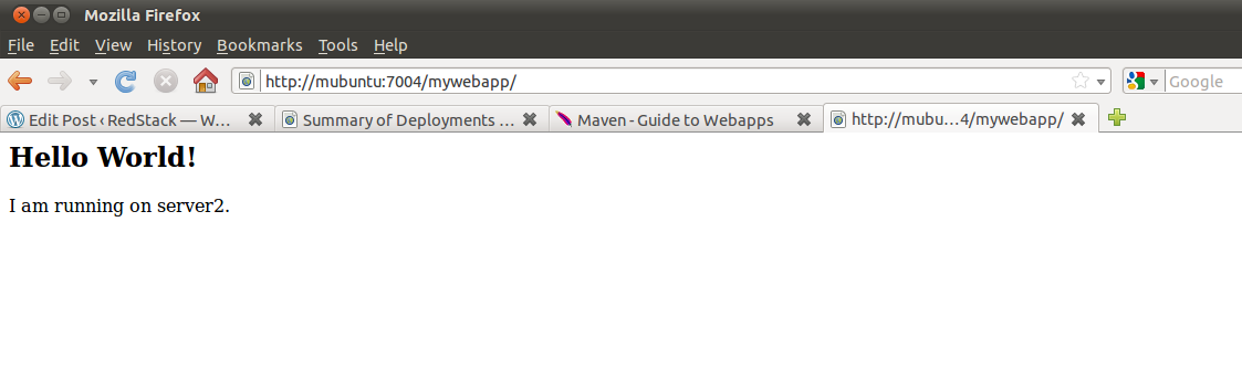Now try the other managed server. The URL will be http://yourserver:7004/mywebapp/ and the output should indicate it is running on server2. Again, substitute in the correct port number if yours is different.