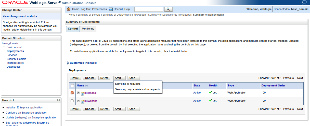 Click on Deployments on the left, select the new web application (myloadbal) and then Start -> Service all requests.