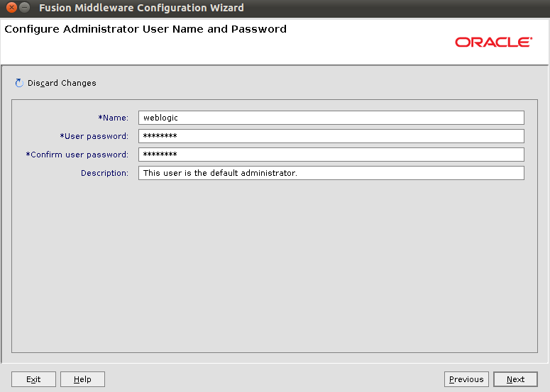 Now, we provide the password for the weblogic administrative user. Then click on Next. You will need to remember this password.