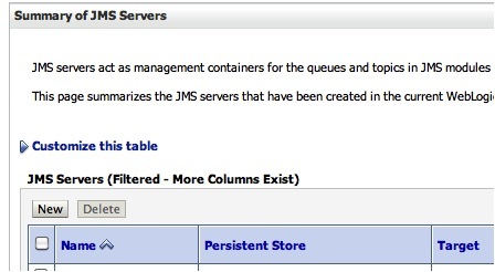 Log in to the WebLogic Server console using your administrative user (probably weblogic) and go to the JMS Servers page by clicking on the link under Services or using the navigation tree on the left hand side.