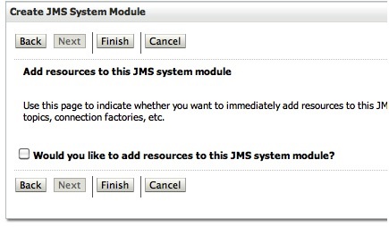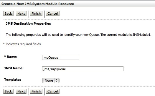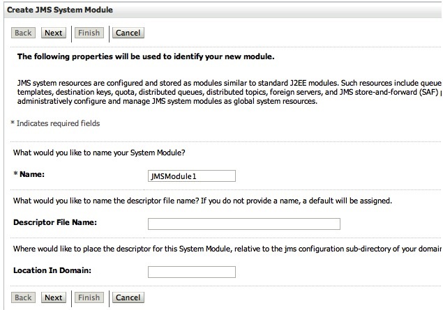 Click on the New button to create a new JMS Module. Enter a name for your JMS Module and then click on Next. I called mine JMSModule1.
