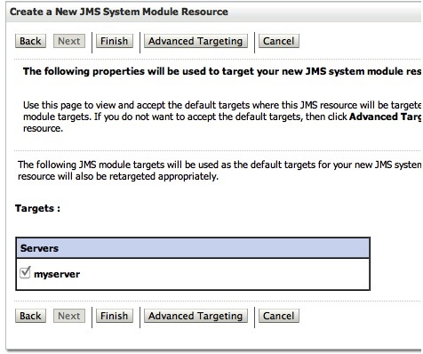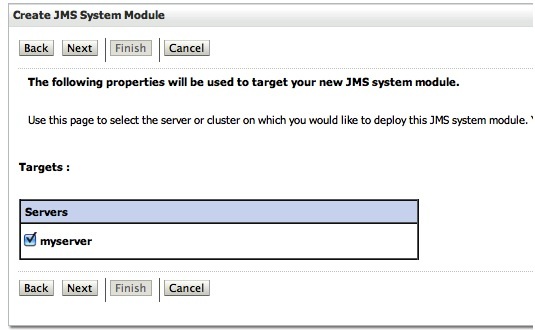 Choose the server that you want this JMS Server deployed on. If you are using the ZIP distribution like me, you will only have one to choose from. Then click on Finish.