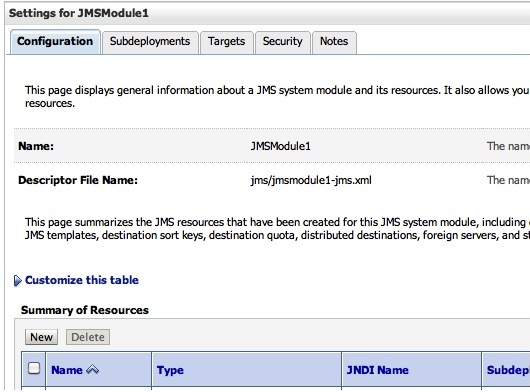 Navigate to your new JMS Module – which will now be listed on the JMS Modules page – and click on the link to view the settings, as shown below. Then click on the New button to create a new resource.