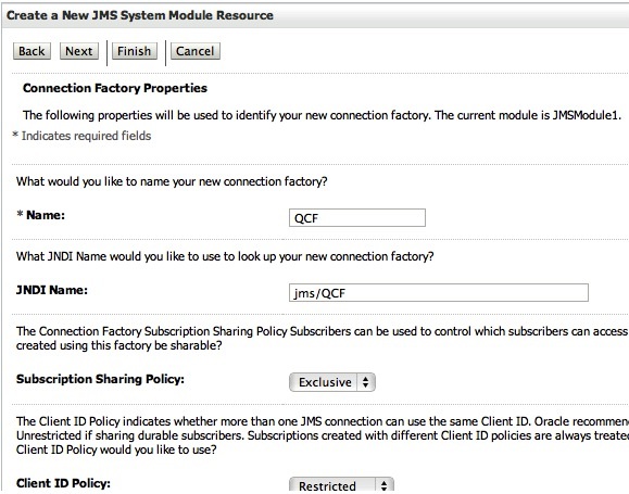 Enter a name and JNDI name for the Connection Factory. These need to match the code. You should use the same names as shown here, or update your Servlet code if you use different names. I called mine QCF and jms/QCF as shown below. Click on Next.