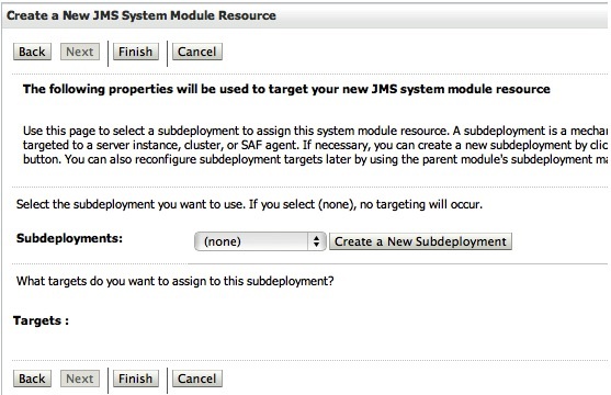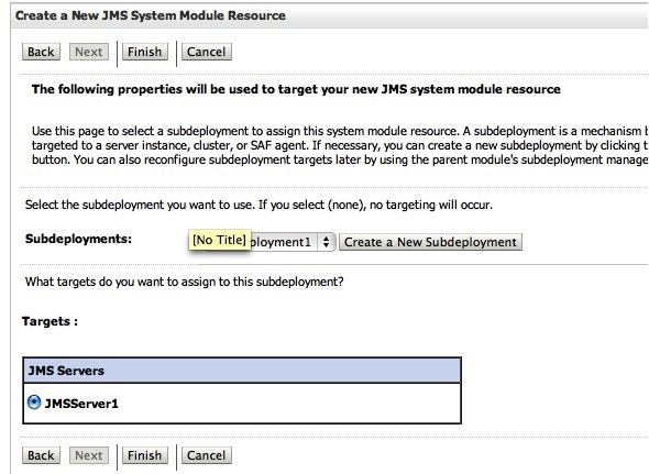 Click on the Create a New Subdeployment button (you only need to do this the first time – if you create additional queues later on you will not need to repeat this step).