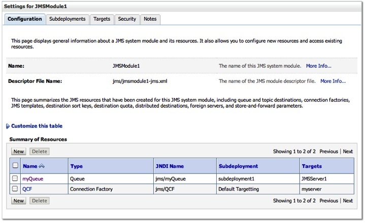 If you return to the settings page for your JMS Module, you will now see the new resources listed as shown below.
