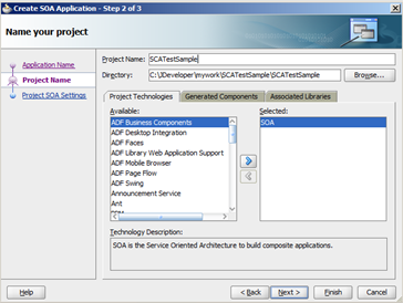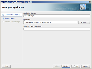 In JDeveloper, select New from the File menu to create a new application.  Choose Applications under General on the left hand side and then SOA Application from the list of templates, then click on OK.  Enter a name for your application.  I called mine SCATestSample: