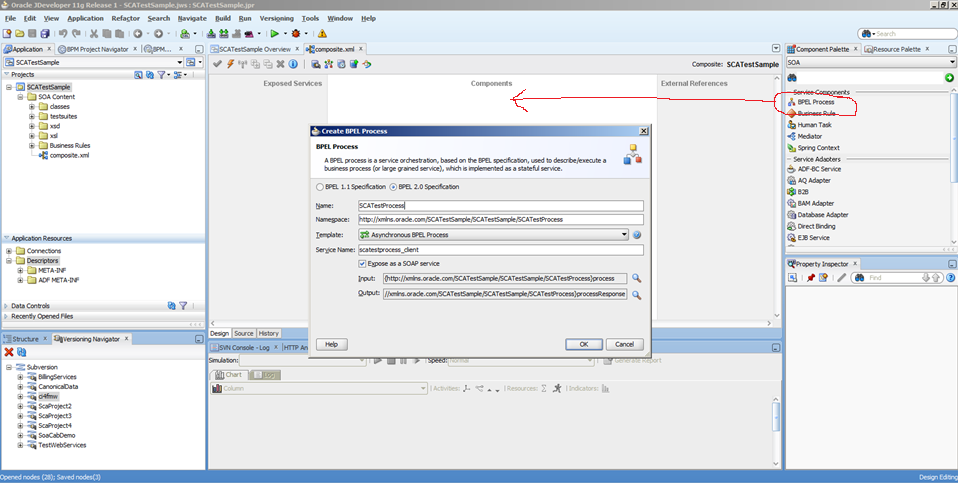 When the composite opens, drag a BPEL Process out of the palette and drop it on the composite.  I used a BPEL 2.0 process.  Give it a name, I called mine SCATestProcess and click on OK to create it.