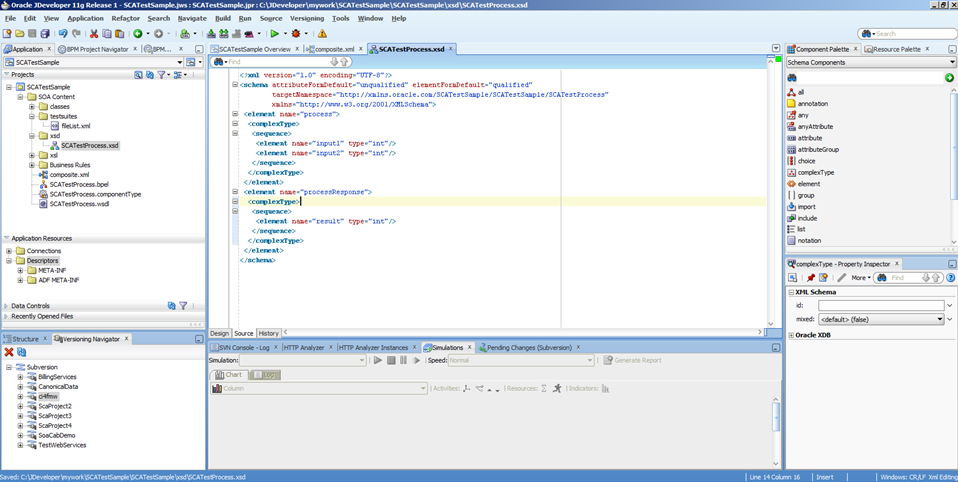 Now, let’s set up our inputs and outputs.  We are going to pass two numbers into the process and have it return the sum of those numbers.  Open up the xsd folder in the project navigator on the left hand side and find the file called SCATestProcess.xsd.  Yours might have a different name if you chose to give your process a different name, but the first part should match the name of your process.