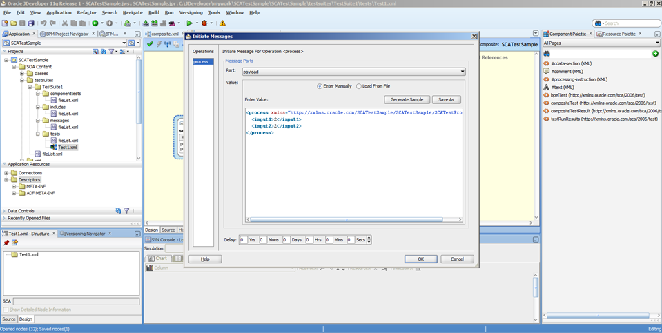 The test will open in the main editor window.  Let’s set up the inputs.  Right click on the ‘exposed service’ in the left hand yellow lane.  Choose Edit Initiate Messages from the popup menu.  Manke sure you have payload selected in the Part and then click on Generate Sample to create a message.  Now just go and edit the data so that both inputs are set to ‘2’ as shown below.  Then click on OK.