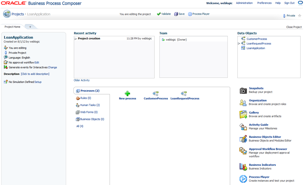 There are a number of enhancements to BPM Composer, the web based process modeling environment. Here is the new project screen, let’s discuss some of the new things we see here: