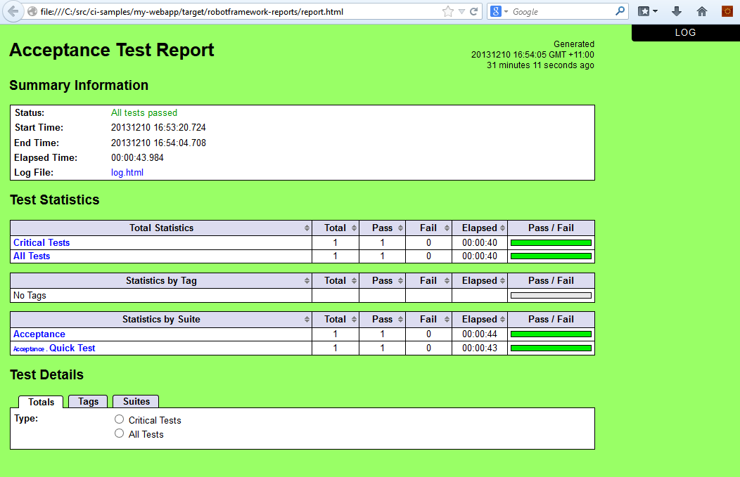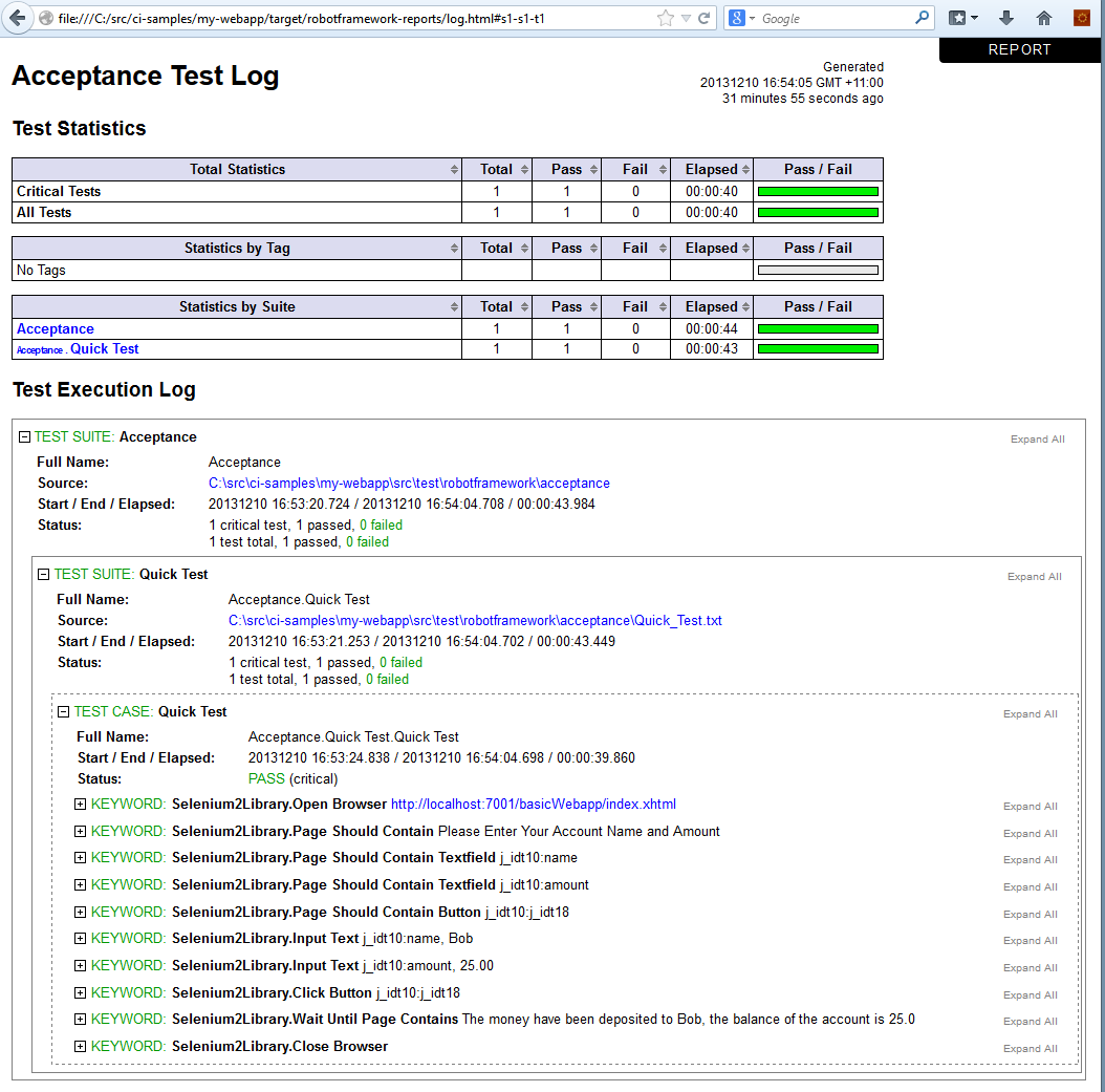 At the end of all this, we can look at the test report, which is located in target/robotframework-reports/report.html (open it with your browser).