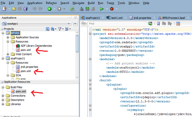 Now if you want to take a look, you will see that you have three POM files – one for the SOA Project (composite), one for the ADF project, and also your application level POM. If you open the application level POM (that’s the one under Application Resources/Build Files, you will see that is is a multi-modules project that lists the other two, as you can see in the image below. It also has some configuration to tell Maven where to find ojdeploy. In this release, we still need to run ojdeploy to build and package the ADF projects, so you do need to have JDeveloper available to your build server if you want to build ADF projects there.