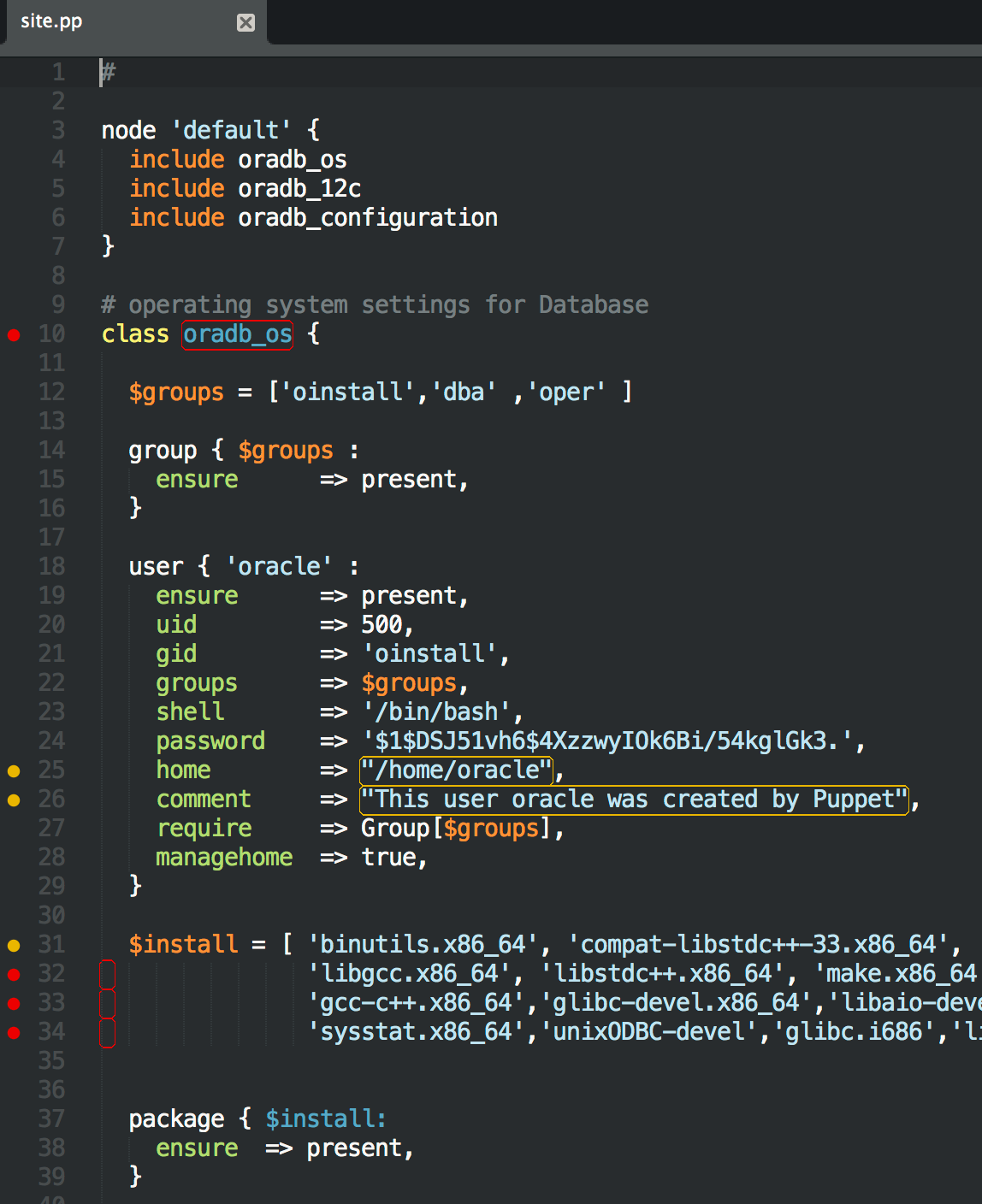 site.pp is the Puppet manifest which contains our configuration for the database installation.You can see a small fragment of the site.pp file below (https://github.com/biemond/docker-database-puppet/blob/master/puppet/manifests/site.pp). This will create the oracle user, the oracle database groups and the required database packages: