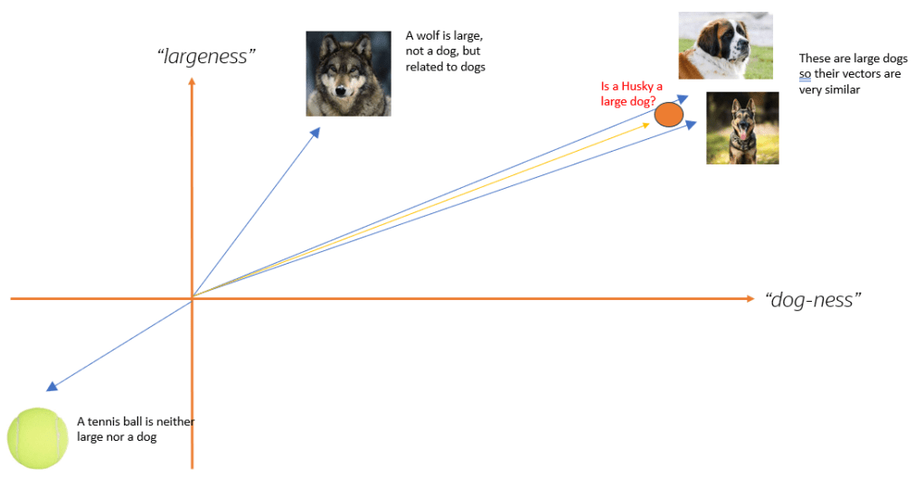 Notice that both the Saint Bernard and the German Shephard (I hope I got those breeds right!) are large dogs. So the vector for both of them are high on both axes, and their vectors are very close together, because in this two-dimensional world, they are indeed very, very similar. The wolf is also large, but it is not actually a dog. Dogs are related to (descended from) wolves, so it is somewhat dog-like, but its vector is quite a distance away from the actual large dogs.