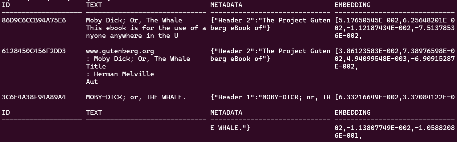 We are using the same model as we did in the previous post, but now we are passing in our splits that we just created – our 500 character long chunks of our larger chunks created from the HTML document respecting the document structure. And we called our vector store table moby_dick_500_30 to make it a little easier to remember what we put in there.
