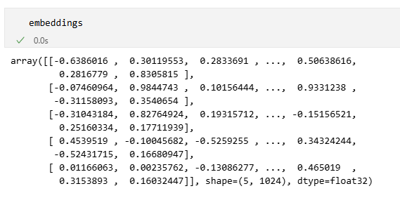 If you want to see what the embeddings look like, just enter “embeddings” in a cell and run it. In the output you can see the shape is 5 (rows) with 1024 dimensions and the type is float32.