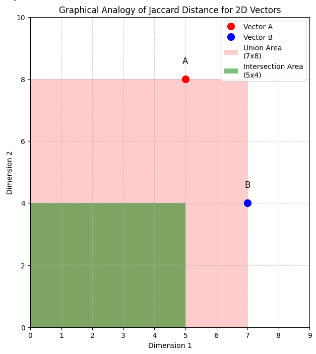 As you can see, the Jaccard distance from [5 8] to [7 4] is 0.4, as we calculated in the example above, and [1 2] to [7 4] is 0.72…