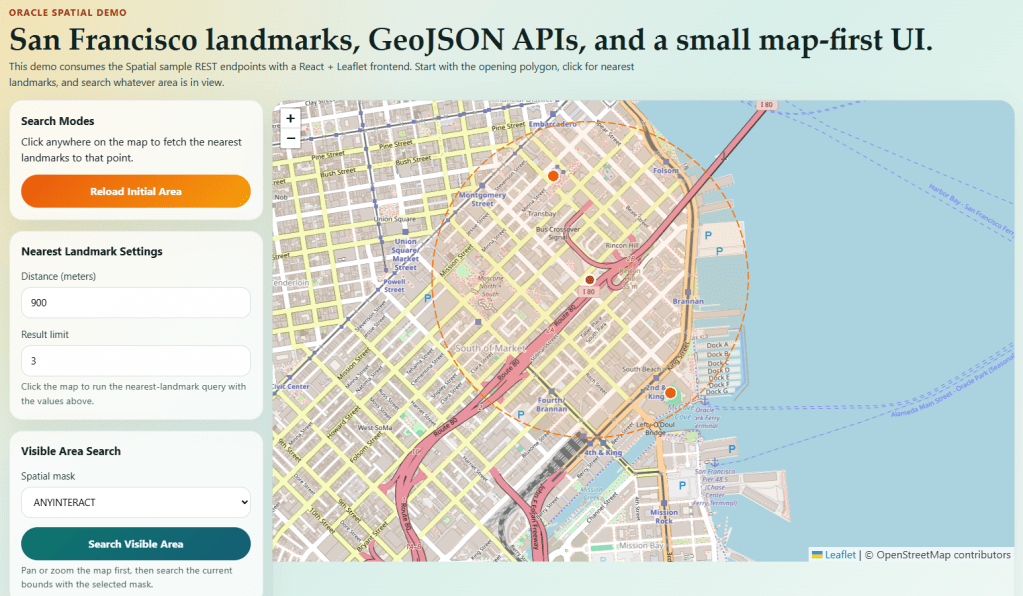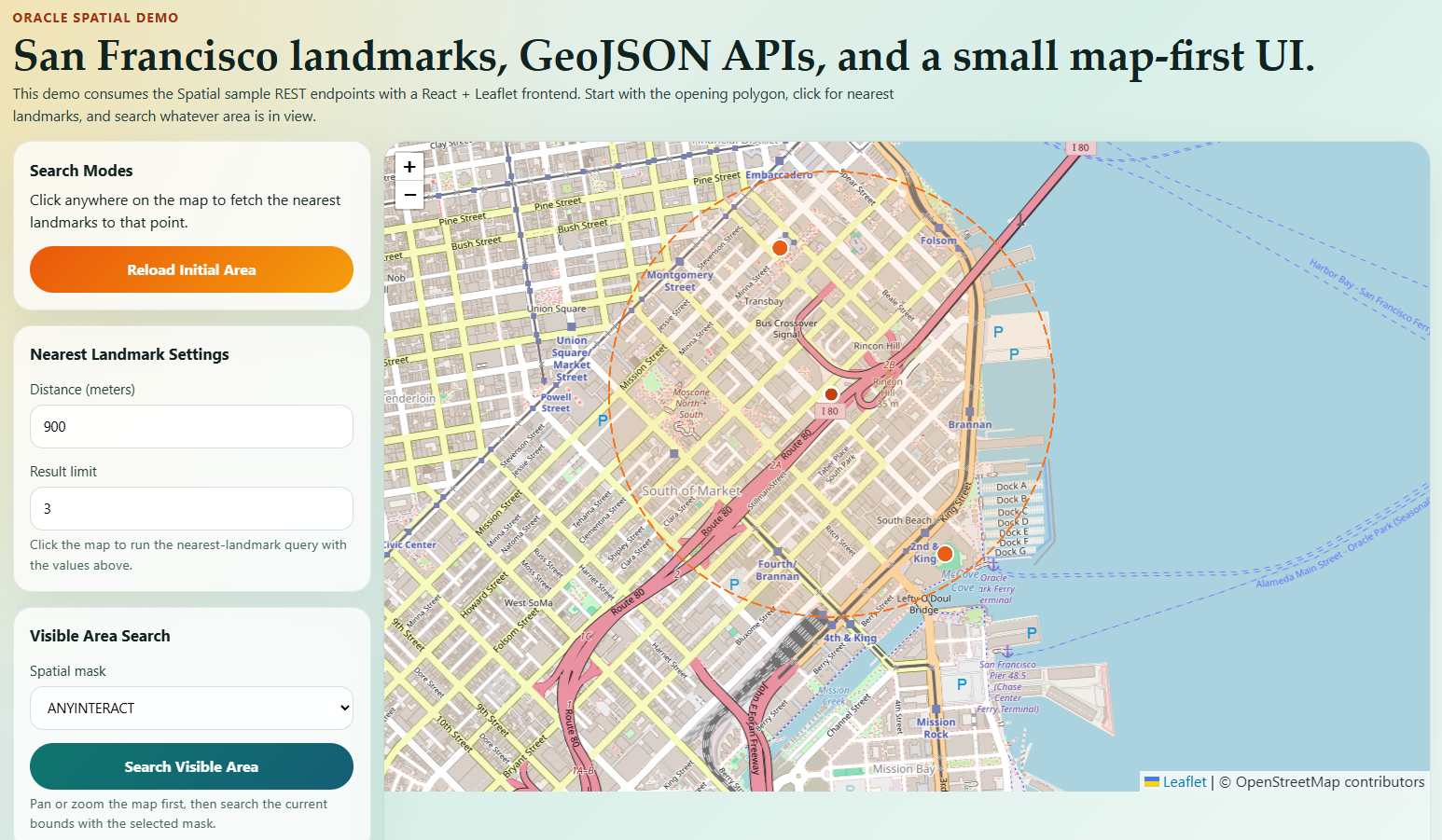 One of the nice things about the sample is that the API boundary stays GeoJSON-first. That means the frontend does not need a special Oracle representation. It can just parse the returned GeoJSON and render it.