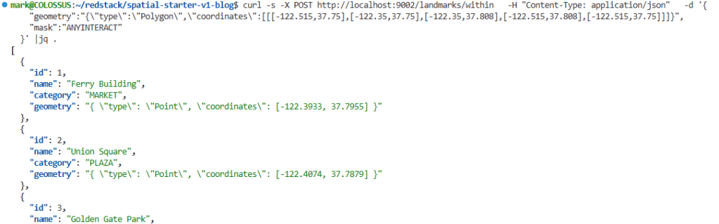 If these calls work, the rest of the article gets a lot simpler. At that point, we know the database is up, the sample app is talking to it, and the spatial endpoints are behaving before the browser gets involved.