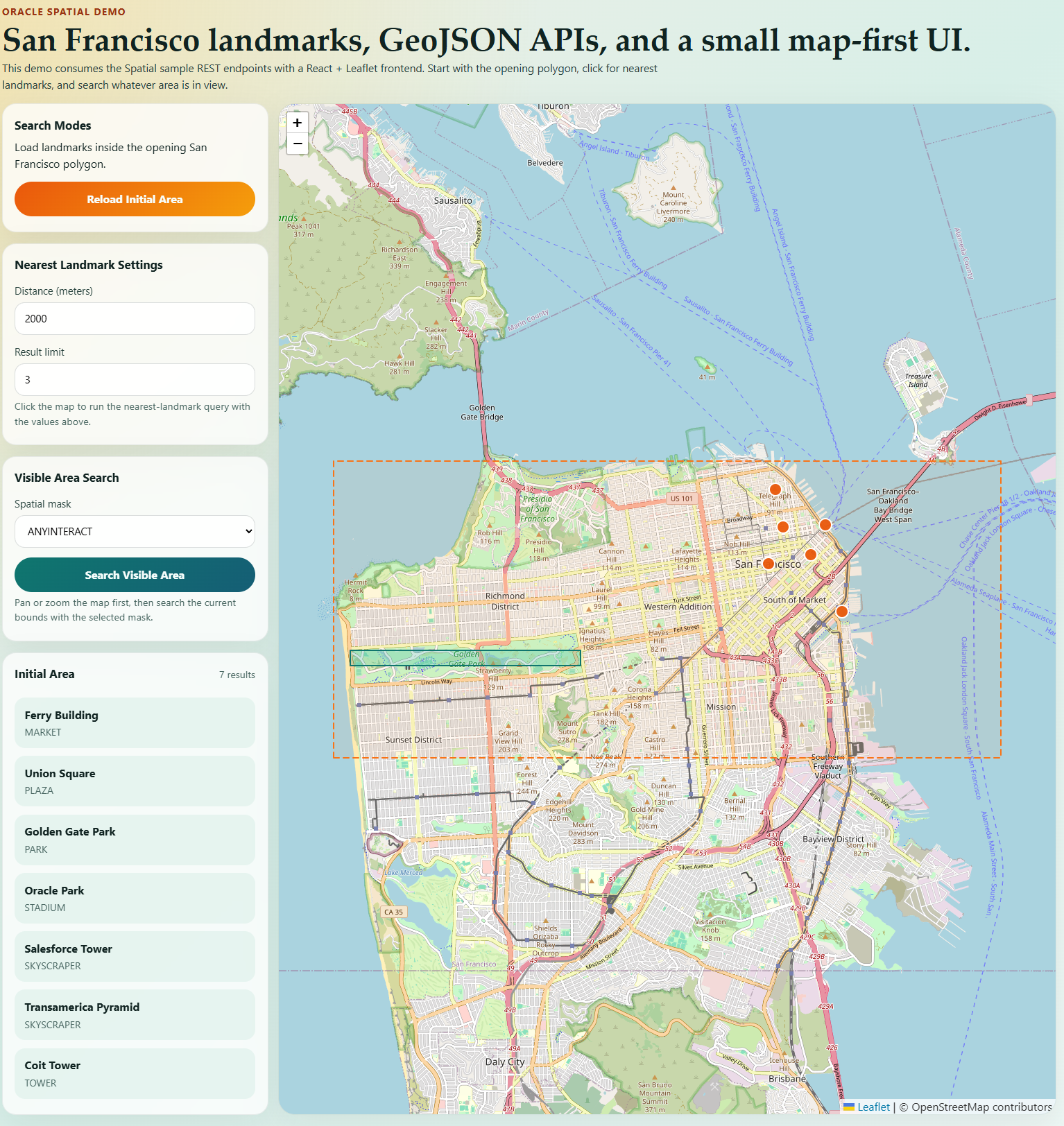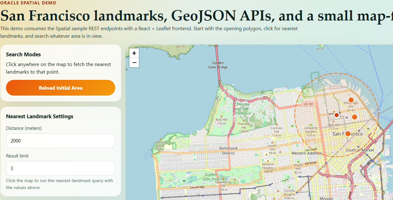 For this example, I used the new Oracle Spatial Spring Boot sample as the backend, then layered a small React + Leaflet application on top of it to: