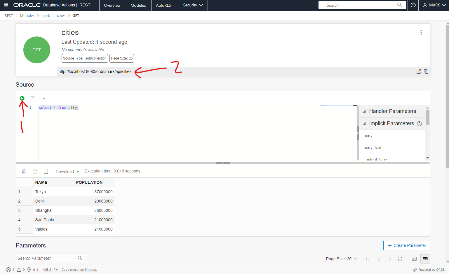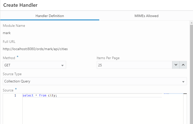 In the “Create Handler” dialog, we provide details of the service. Notice that you can choose the HTTP Method (GET, POST, DELETE, etc.) and you can control paging. For this service, we want to create a GET handler and we want the “Source Type” to be Collection Query which lets us enter an SQL statement. While you are here, have a look in the pull down and notice that you can also use PL/SQL! You can also use bind variables in here, so we can accept parameters and use them in the query or PL/SQL code.