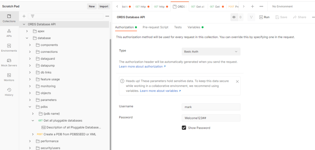 One good thing about Postman is that we can set the authentication parameters at the top level, on that “ORDS Database API” folder that you just created. Open that and click on the “Authorization” tab, choose “Basic Auth” as the type and enter the database user and password: