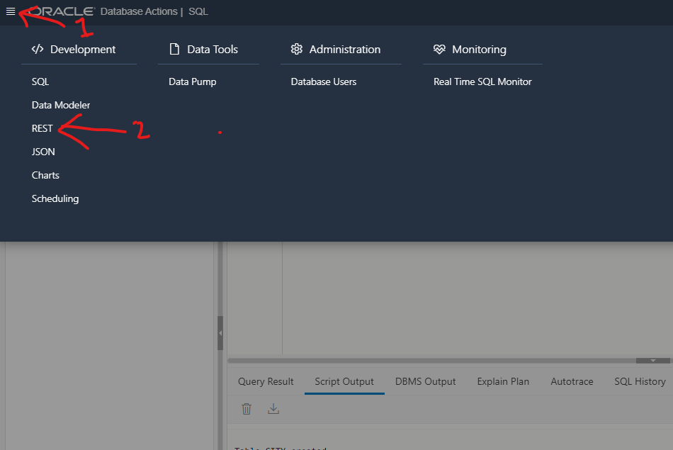 ORDS allows us to easily expose an SQL statement, or a PL/SQL block as a REST service. Let’s navigate to the REST page – click on the “hamburger menu” (1) and then the REST page (2):