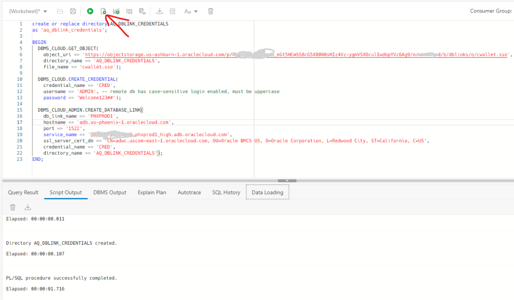 Click on the “Run Script” icon to execute these statements – its the one the red arrow is highlighting: